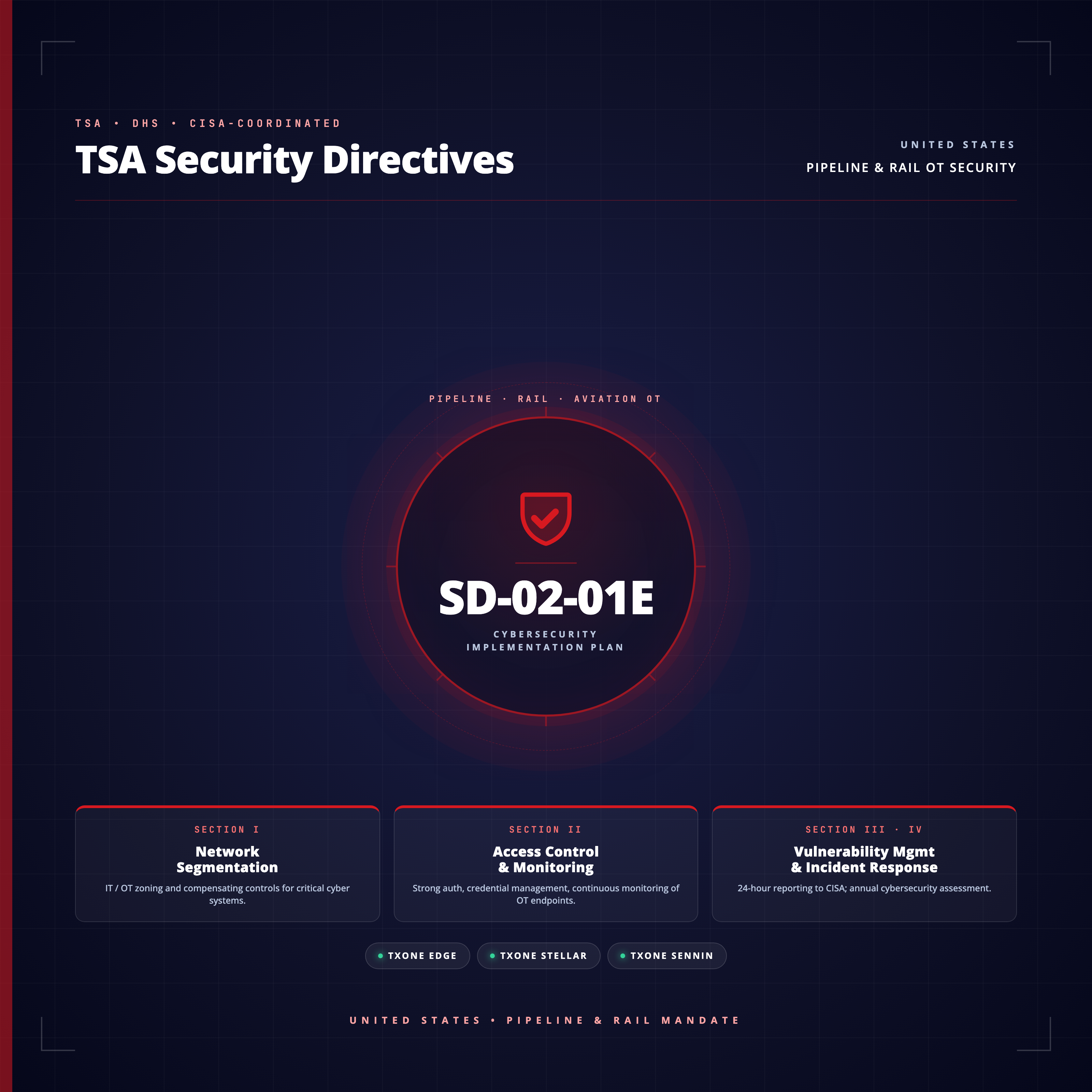 Born from the Colonial Pipeline attack. Following the 2021 ransomware attack that disrupted fuel supplies across the eastern United States, TSA issued cybersecurity directives targeting pipeline operators and surface transportation. The current pipeline directive (SD Pipeline-2021-02D) focuses on key outcomes: network segmentation, access control, continuous monitoring, and vulnerability management. Parallel directives apply similar requirements to Class I railroads and higher-risk transit agencies. TSA takes a performance-based approach, focusing on outcomes rather than prescribed technologies. Operators must submit TSA-approved cybersecurity implementation plans and conduct regular testing to demonstrate security effectiveness. This outcome-focused approach aligns with TXOne's methodology. TXOne solutions provide the capabilities to demonstrate required security outcomes while working within the constraints of pipeline and rail OT environments.