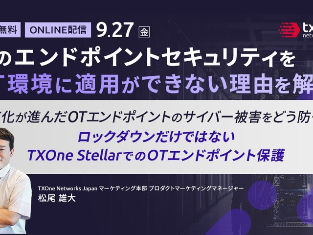 OT環境では技術的・運用的な側面からエンドポイント保護を適用することは難しいと考えられがちです。また、エンドポイント保護ができたとしてもロックダウンによる保護しか適用できていないというケースが多く存在します。一方で脅威の高度化や製造業のDX化が進む中でロックダウンだけが必ずしも最適な保護方法ではないというケースも出てきています。本ウェビナーではTXOneのエンドポイント保護「Stellar」はなぜOTエンドポイントに適用することが可能なのか、なぜロックダウン以外の機能も多く提供しているのかなどについてご紹介させて頂きます。